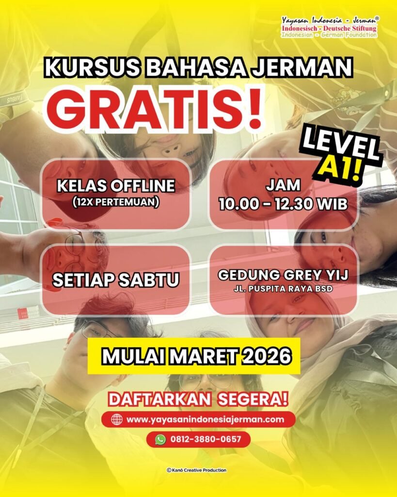 Kursus Bahasa Jerman Level A1 Gratis Leave a Comment / Uncategorized / By Admin YIJ Facebook Twitter LinkedIn Google+ StumbleUpon Pinterest Shares Hi semua!!! kami kembali membuka kelas bahasa Jerman level A1 Free bagi siswa/i SMA kelas 10-12! yuk segera daftar!